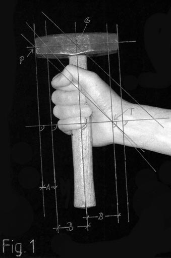 3. As visible in the Fig. 1, the distance between the hitting point P, and the centre of gravity Point G, is, distance A, plus distance B, and is therefore greater than the distance between the centre line along the handle, and the turning point in the wrist, point T. Therefore, using the traditional German Stone Masons Hammer puts a great strain on the ligaments in the wrist, and lower arm. In comparison my Spherical Mace Hammer, shown in Fig. 2, has the following advantages. 1. As its head is round, all that happens, should you slip off the end of the chisel, is that you push the chisel hand out of the way, without hurting yourselves. 2. As it has no protruding parts, it only makes a dry thudding noise. The loudest noise, when using it, for stone carving, is made, by the tip of the chisel, breaking the stone. 3. As the distance, between the turning point T, in the wrist, and the middle of the handle; distance B; is the same as the distance between the hitting point P, and the centre of gravity, in the hammer head; point G; the strain on the ligaments in the wrist is minimal.