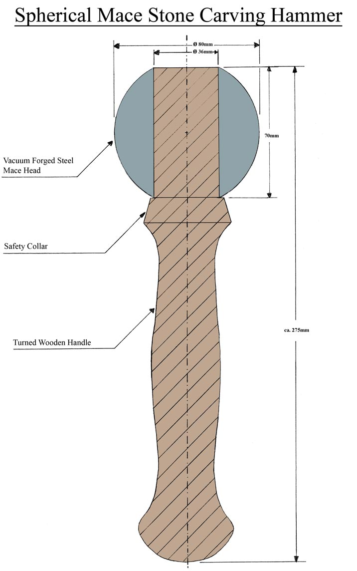 These need to be round in diameter. Ordinary hammer handles are oval in diameter, and not suitable for a Mace Hammer. Close to the mace head, the handle should have a protective collar. This is necessary as the only way you can hurt your hands when using a Mace Stone Carving Hammer is when your hand holds the Mace Hammer directly under the Mace Head, and you slip off the chisel end in such a way, that the fingers of the hand holding the Mace Hammer are trapped between the handle of the hammer and the chisel end.
